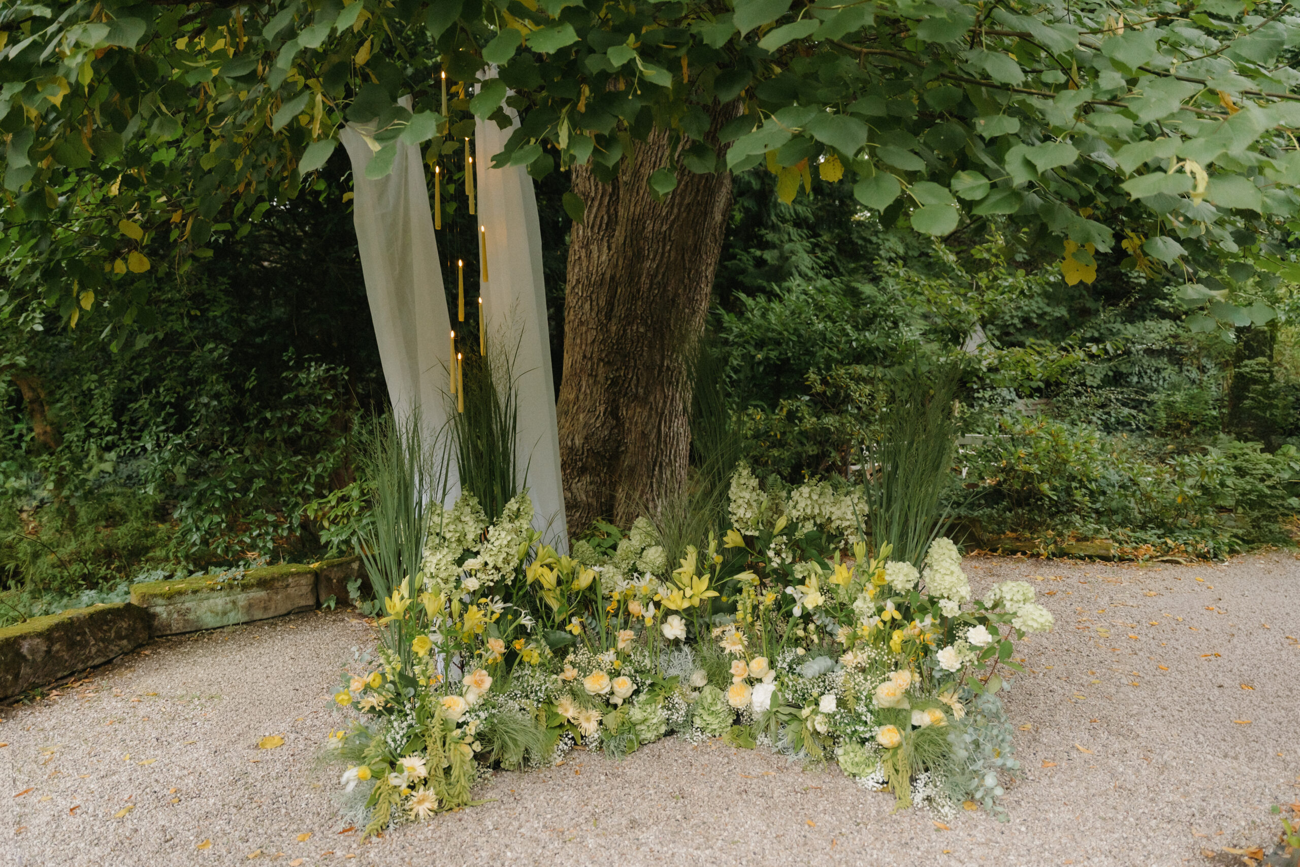 Herbsthochzeiten haben für mich immer eine ganz besondere Magie – das goldene Licht, die klare Luft, die ersten bunten Blätter. Für unser Shooting in Göttingen wollte ich zeigen, dass diese Jahreszeit nicht nur warm und gemütlich sein kann, sondern auch modern, elegant und überraschend anders. Stellt euch eine freie Trauung vor, bei der keine klassischen Bögen den Rahmen bilden, sondern leichte Tücher, die zwischen den Bäumen schweben. Dazwischen hängen Kerzen hinab, die im Wind sanft schaukeln. Rundherum üppiges Grün, Pflanzen, die sich wie ein kleiner Garten um das Paar schmiegen – ein Setting, das gleichzeitig natürlich und außergewöhnlich wirkt.